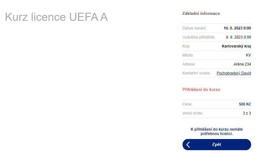 Pokud trenér nemá oprávnění pro přihlášení do kurzu, aplikace Staň se trenérem mu zobrazí informaci, že se nemůže do kurzu přihlásit: