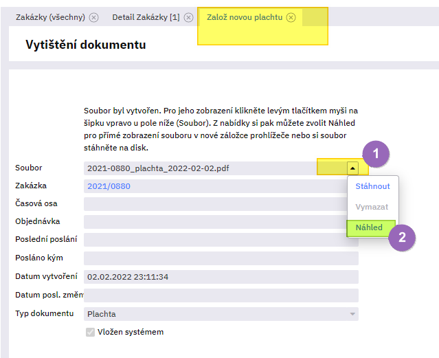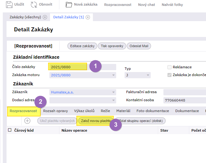 - Na detailu zakázky - v tomto případě 2021/0880 lze na záložce Rozpracovanost stisknout tlačítko Založ novou plachtu: