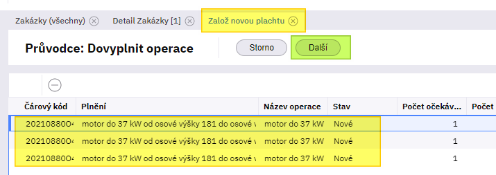 - Spustí průvodce vytvořením plachty - automaticky doplní operace (pokud je vše správně nastaveno v číselníku Typy motorů).